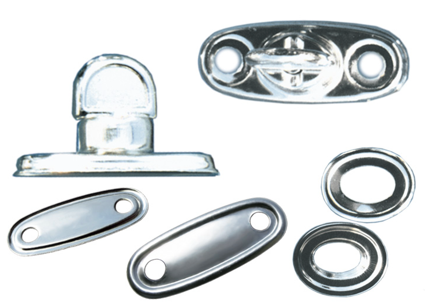 Chromuotas žalvarinis tento fiksatorius su montavimo plokštele. Naudojamas tentų, uždangalų, sėdynių apmušalų ar kitų jūrinių drobių tvirtinimui. Užtikrina greitą ir patikimą sujungimą, atsparus korozijai bei ilgaamžis net drėgnoje aplinkoje.