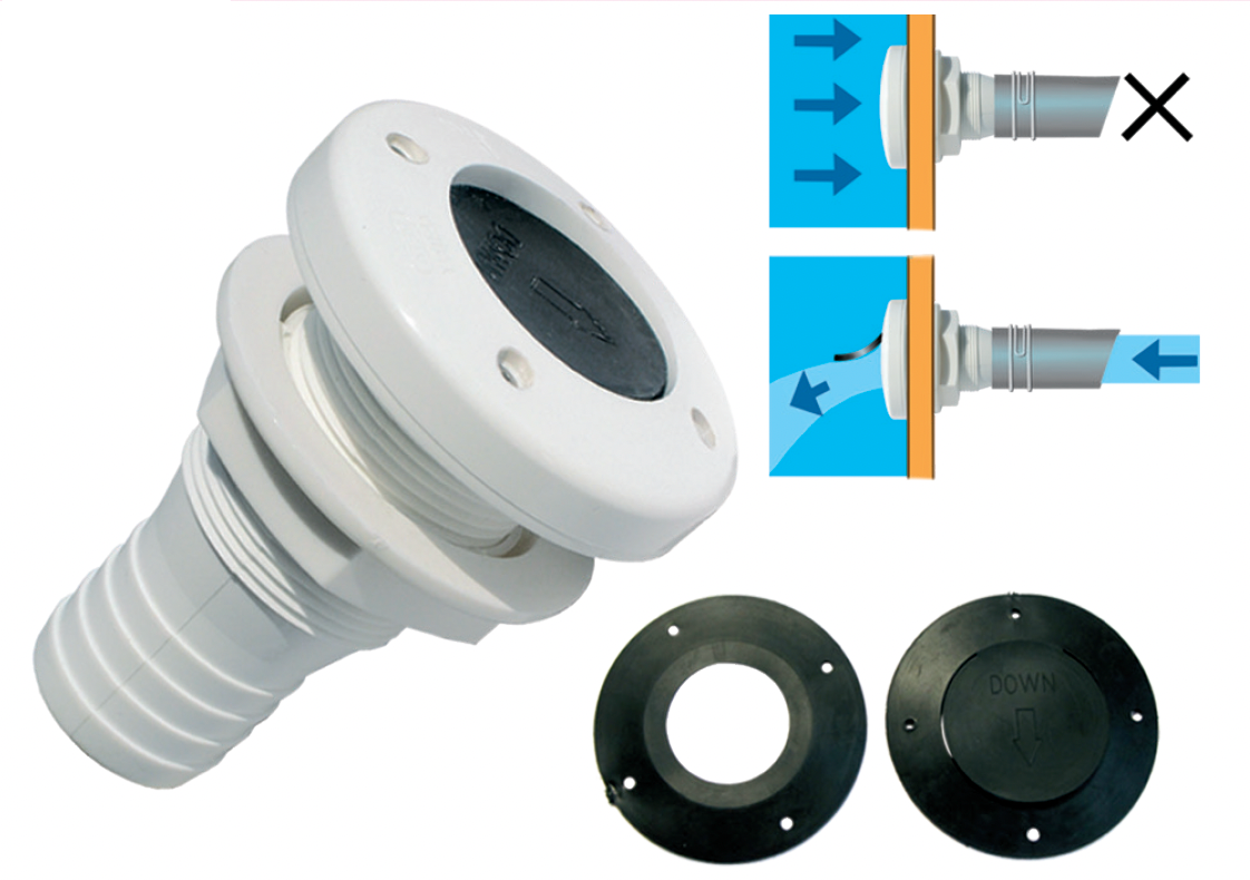 Drenažo išleidimo detalė su atbuliniu vožtuvu, montuojama per laivo korpusą ar trancą.