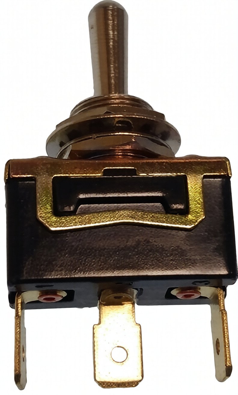 Trigubos padėties svirtinis jungiklis su chromuota žalvario svirtimi ir plastikiniu korpusu. Tinka naudoti įvairioms elektrinėms grandinėms valdyti. Montuojamas į paneles iki 9,5 mm storio.