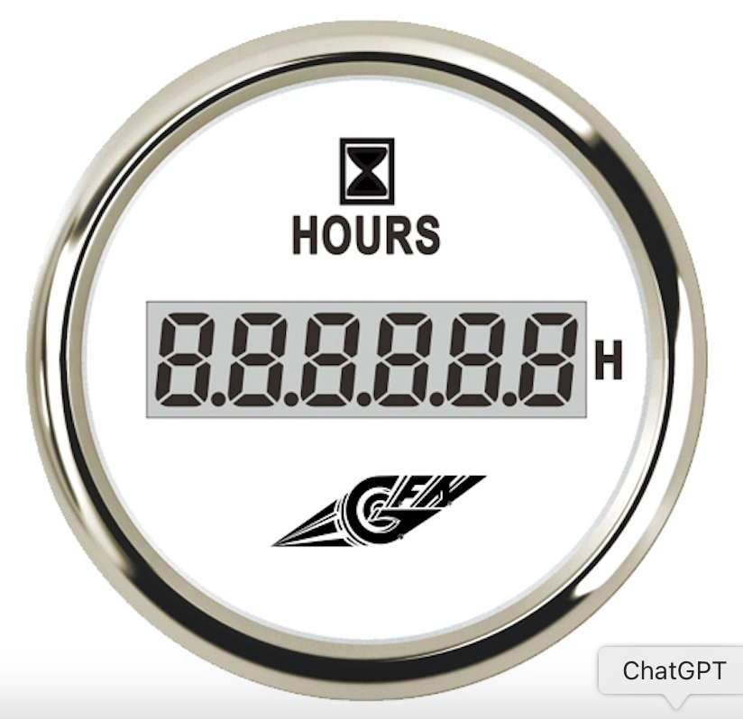 Skaitmeninis valandų skaitiklis (hourmeter) skirtas laivo variklio darbo laikui matuoti. Tvirtinamas į prietaisų skydelį, atsparus vandeniui (IP67), su naktiniu pašvietimu. Pagamintas iš technopolimero korpuso su nerūdijančio plieno apvadu.