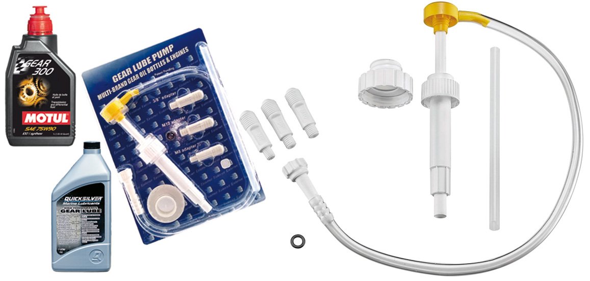 Rankinė tepalo pompa su sriegine veržle, leidžiančia ją tiesiogiai prisukti prie reduktoriaus. Komplekte yra adapteriai tiek JAV, tiek Europos sriegiui bei 3 skirtingi antgaliai (3/8″, M8, M10), tinkami naudoti su 2- ir 4-takčiais pakabinamais varikliais bei Volvo SX, Mercruiser, OMC ir OMC Cobra reduktoriais.