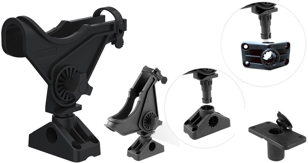 Tvirtas meškerės laikiklis pagamintas iš sutvirtinto nailono. Sukasi 360° horizontaliai ir 90° vertikaliai. Greito nuėmimo ir tvirtinimo sistema leidžia lengvai išimti laikiklį nuo bazės, todėl puikiai tinka žvejybai tiek iš valties, tiek iš katerio.