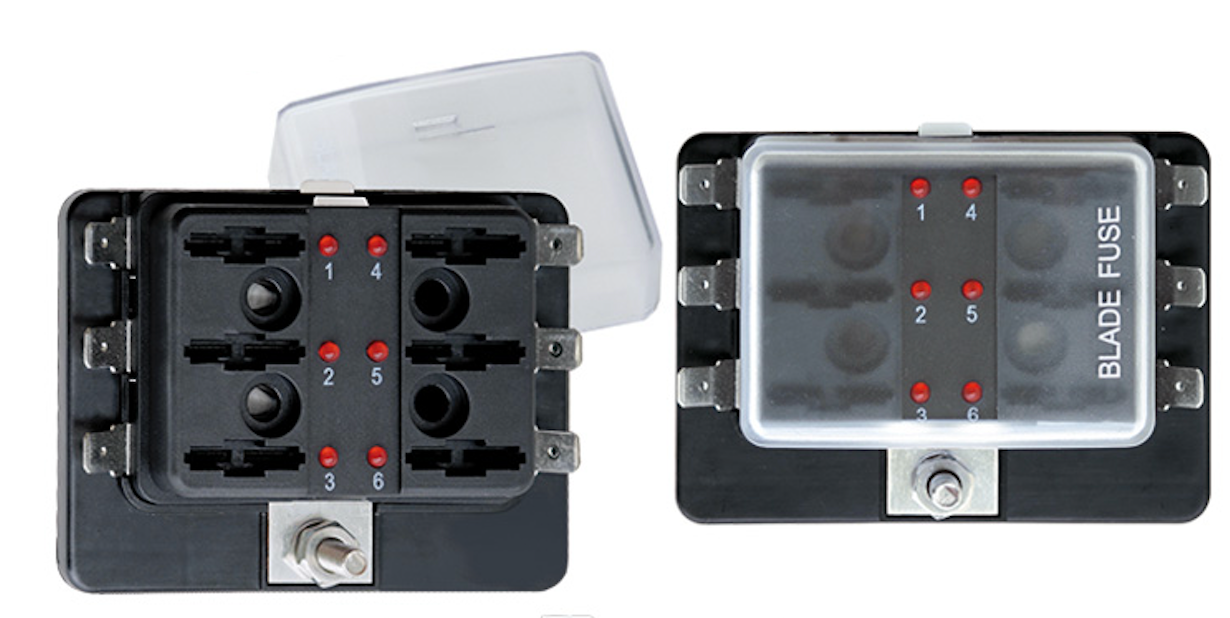 Kompaktiškas saugiklių blokas su LED indikacija, leidžiantis greitai nustatyti, kuris saugiklis perdegė – šalia jo užsidega raudonas LED indikatorius. Skirtas automobiliniams saugikliams. Patikimas sprendimas katerių, jachtų ir kitos elektros įrangos grandinių apsaugai.