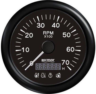 Juodas tachometras su integruotu skaitmeniniu ekranu, 4 LED aliarmo indikatoriais ir val. skaitliuku. Rodo apsukas nuo 0 iki 7000 rpm (X100). Tinka naudoti su vidaus degimo varikliais. Skersmuo – 100 mm.
