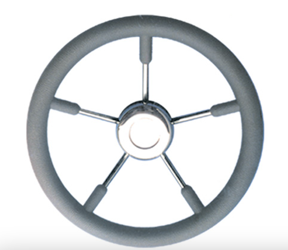 Tvirtas nerūdijančio plieno vairas su penkiais stipinais ir patogiu pilkos spalvos poliuretano apvadu. Atsparus UV spinduliams, todėl išlaiko spalvą ir paviršiaus kokybę net intensyviai naudojant jūrinėmis sąlygomis. Idealiai tinka valtims, kateriams ar jachtoms.