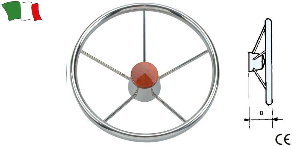 Aukštos kokybės vairas su penkiais stipinais, pagamintas iš poliruoto nerūdijančio plieno. Komplektuojamas su nerūdijančio plieno stebuliu. Atitinka tarptautinius saugos standartus UNI EN 28848, UNI ISO 29775 ir ABYC P22. Patikimas ir ilgaamžis sprendimas kateriams bei jachtoms.