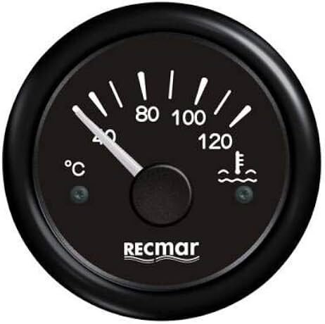 Analoginis vandens temperatūros indikatorius su juodu rėmeliu, skirtas stebėti variklio aušinimo temperatūra.